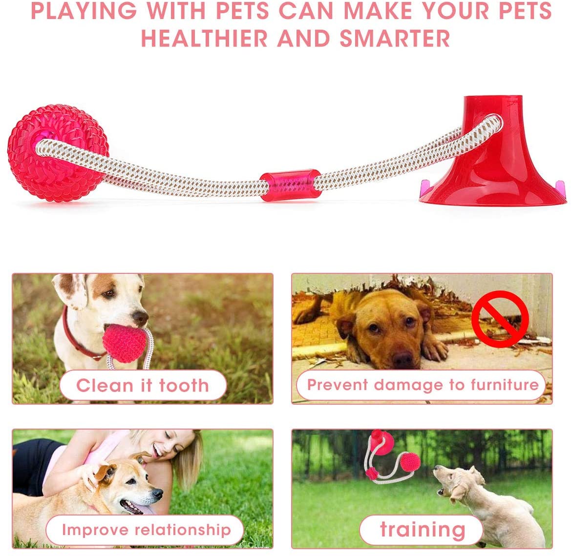 This Tug-O-War Chew Toy is a perfect toy for dogs that get bored when left alone in their house as they can play tug of war without you the owner even needing to be there. Simply use the suction cup to stick to any surface and let your dog become obsessed with trying to rip it off whatever surface it is stuck too. Hands Free Suction Toy For Dogs 444x444 GIF Does your dog ever get easily bored when they are in the house on their own? Most dogs do, they are all cuddly animals who love nobody as much as they love you their owner. When you go missing for a couple of hours your lovely furry friend is at one of their lowest points as all they want is to be back with you. Dogs are very social creatures and if they are left on their own for more than four to six hours they can get lonely which leads to potential isolation distress. You may ask is there a solution? 100%. With our hand's free pull toy with a built-in a suction cup your dog can create its own entertainment by interacting with this toy that just sticks to any suitable surface. The powerful suction cup is strong and can stay stuck to a surface for hours at a time, even with a shredded doggo pulling at it for an extended amount of time. Let your dog play tug of war for as long as they like without having to get involved yourself! The toy attaches a soft rubber ball that is rather bouncy to a suction cup that can stick to any hard surface. You don't have to stick it to a surface though, if you'd like to just play tug of war with your best friend then you can do that as well considering it's a multi-functional toy. ✅MADE OF NON-TOXIC RUBBER MATERIAL - The material the toy is made out of is perfect for dogs who love to chew and batter anything they can get their paws on. It's made from a rubber material that is super soft but at the same time completely durable to make sure it lasts long against your vicious canine. ✅VERY EFFECTIVE SUCTION CUP DESIGN - You can release your hands and let your doggo play with the toy by simply sticking it to a surface that sticks to the suction cup. ✅GREAT FOR YOUR DOGS DENTAL HEALTH - This toy's strong and soft texture is designed to be perfect for your dog's gums giving them a decent workout as they chew it. With a bright look, it is attractive for the dog and makes them not refuse it. It has a very bright design, it definitely catches your dog's attention with its eye-catching appearance. ✅FUNNY AND INTERESTING - It's not just your standard ball either it's material makes it easy to bounce off the ground so your dog will have a blast running around with it. You can easily use this toy at a place other than home including a garden, park or even on the shoreline if you'd like.
